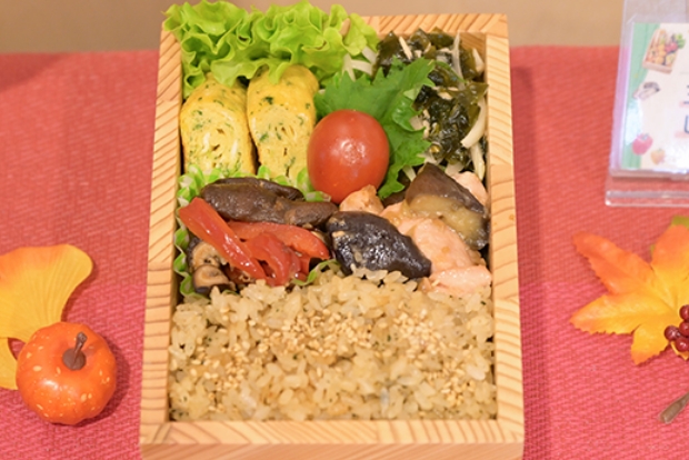 宮城の食材を親しみやすく楽しめる「世代を超えて食べられるお弁当」です。主食は登米産みそと大葉を混ぜた香り豊かなごはん。主菜は宮城県産の酒となすを使い、甘たれで仕上げた照り焼きで、なすが苦手な人でも食べやすく工夫しました。副菜には小松菜の卵焼き、椎茸とパプリカのおかか炒め、わかめとツナの和え物を添え、彩りも栄養も満点。子供から大人まで楽しめる、地産地消の一箱です。