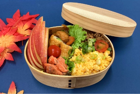 秋になると栗駒山はすごくきれいな紅葉が広がっています。私達はそれを再現しようと思い紅葉の色を使ったお弁当を作りました。まずは鮭とパプリカ、しめじを入れた炊き込みご飯のおにぎりにすることで栗駒山を再現しました。おかずも赤いパプリカと秋の果物のりんごを使用し、秋を感じられる工夫をしました。さらに大葉をいれることで完全に紅葉してない葉を表現しました。主に食材を作ってくれた農家の方に感謝の気持ちを込めて作りました。